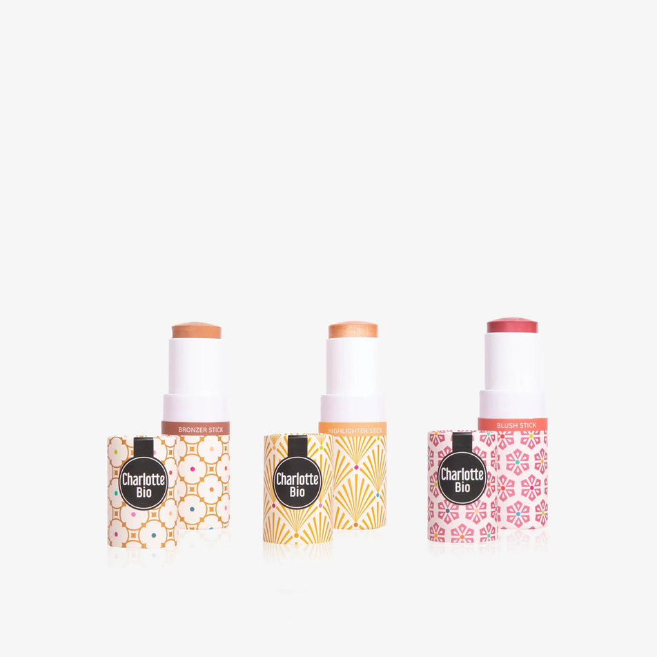 Ontdek onze Ecocert en Cosmébio gecertificeerde biologische teint stick trio, gemaakt met 100% natuurlijke ingrediënten en een minimum van 50% biologische ingrediënten. Dit trio biedt een zuivere formule die je teint vormgeeft, verheldert en laat stralen.