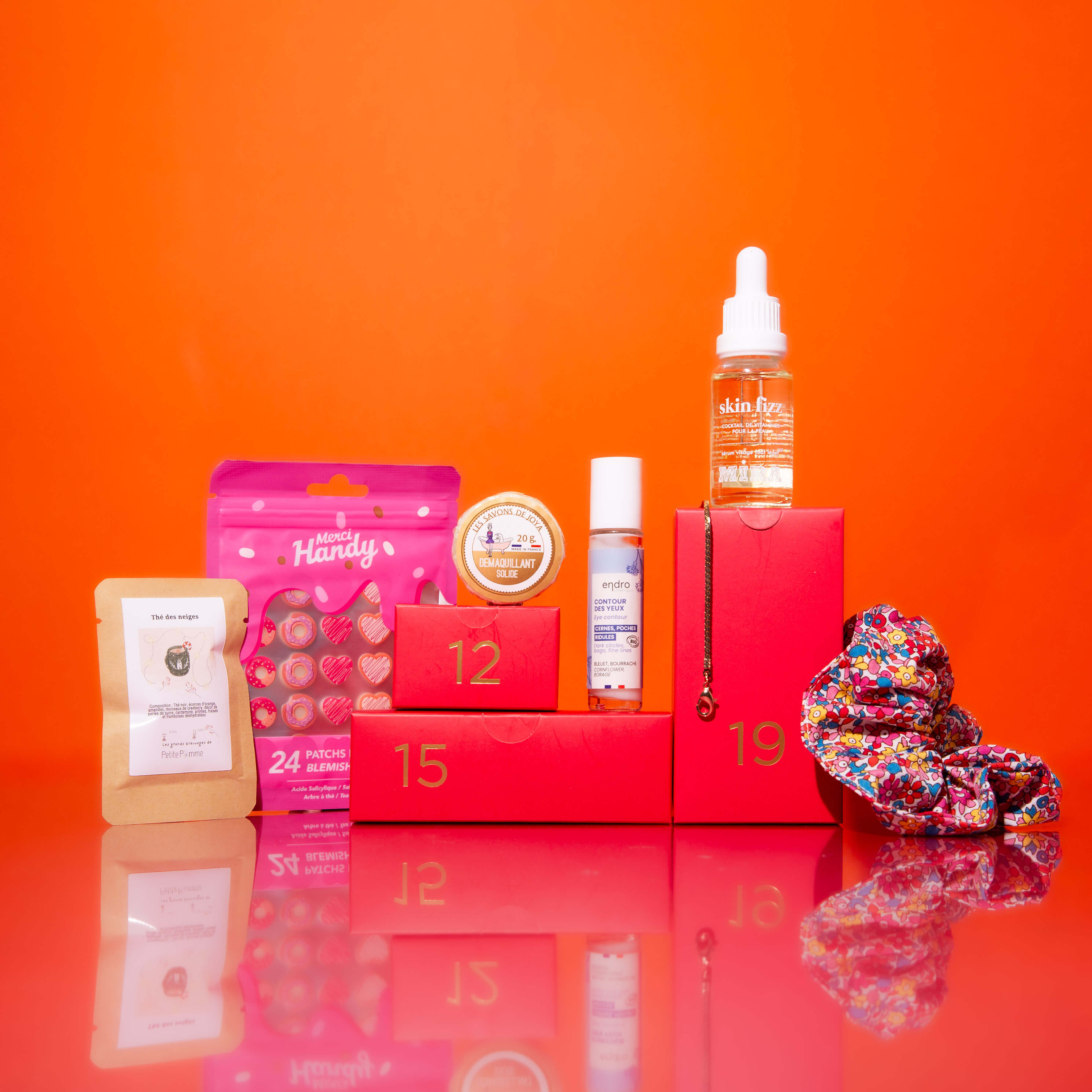 Geniet van een Endro oogcontour, een Merci Handy anti-puistpleister, een mooie Balaboosté armband, een Savons de Joya solid make-up remover, een Petite Pomme theezakje, een stijlvolle Papa Pique en Maman Coud scrunchie en een Mira gezichtsolie.