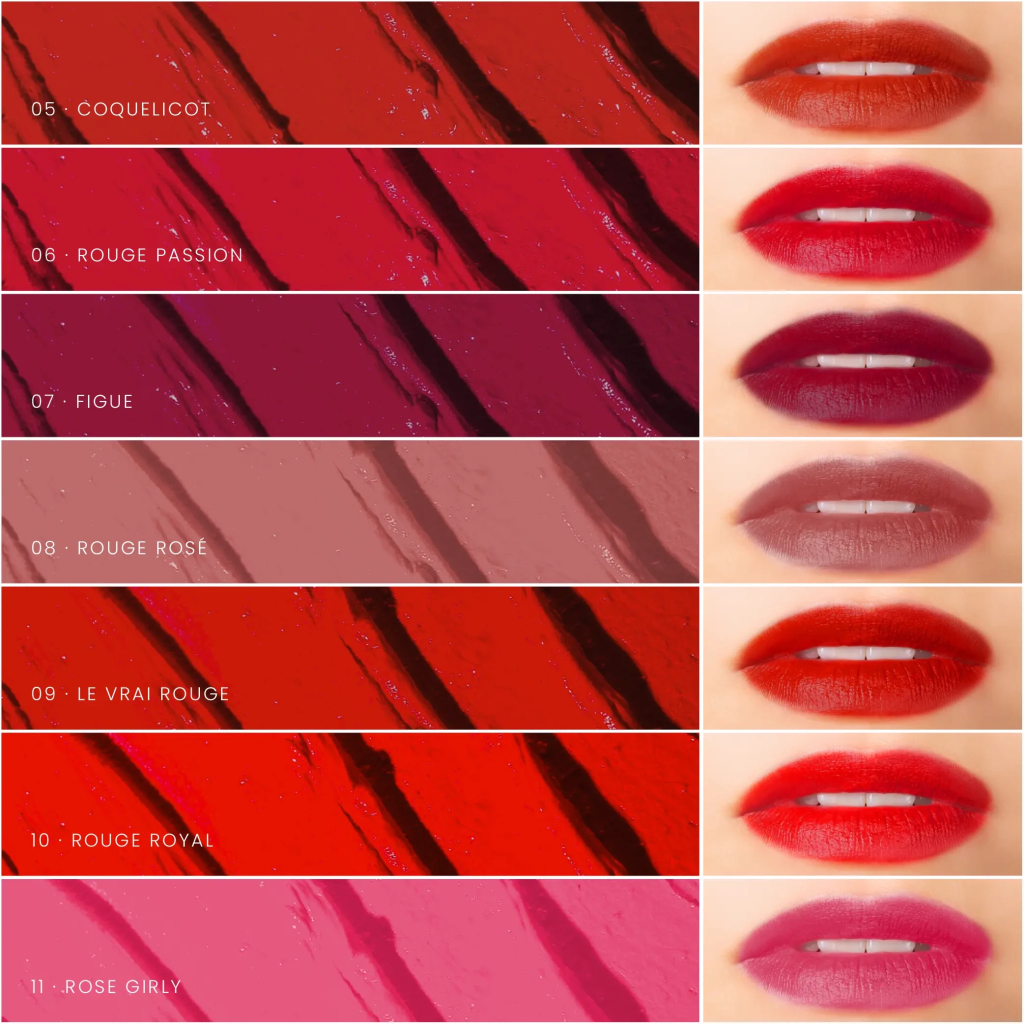 👉 Grâce à nos 7 teintes de rouges à lèvres mat, trouvez facilement le rouge à lèvres idéal selon votre carnation et révélez la beauté naturelle de vos lèvres.