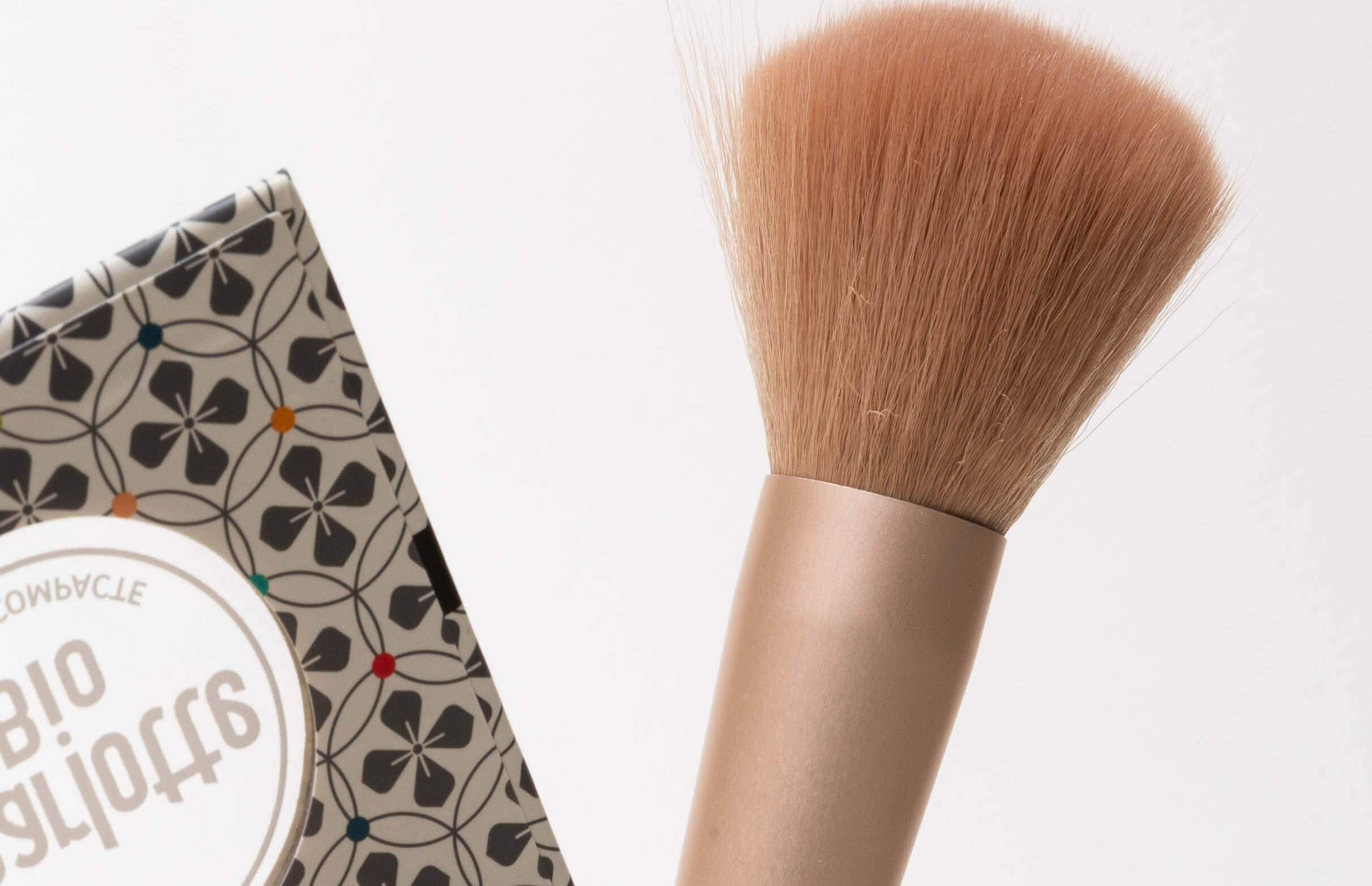 Neem wat compact poeder uit de haren van onze matterende poederkwast en breng het met ronddraaiende bewegingen over je hele gezicht aan. Besteed vooral aandacht aan de T-zone (voorhoofd, neus en kin). Vergeet je hals niet!