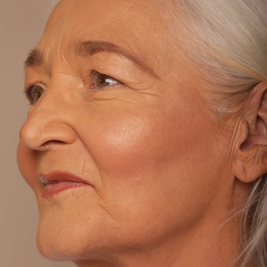 Een rijpere huid vertoont vaak tekenen van droogte, meer rimpels en fijne lijntjes en een verlies aan teint.
