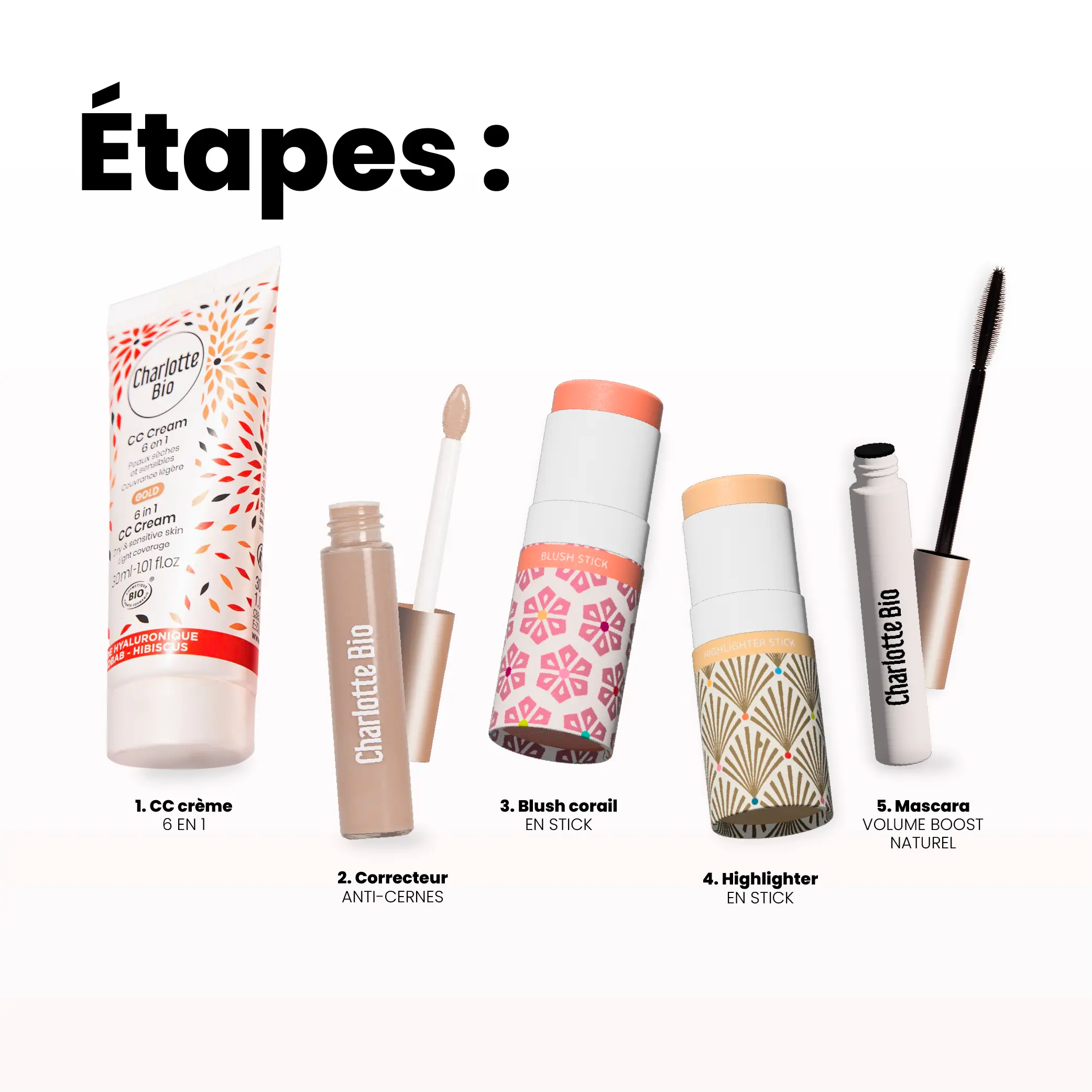 Begin met het aanbrengen van Hydraterende CC Crème over je hele gezicht en hals. Deze behandeling egaliseert de teint en hydrateert de huid.